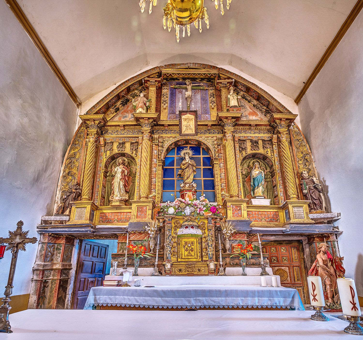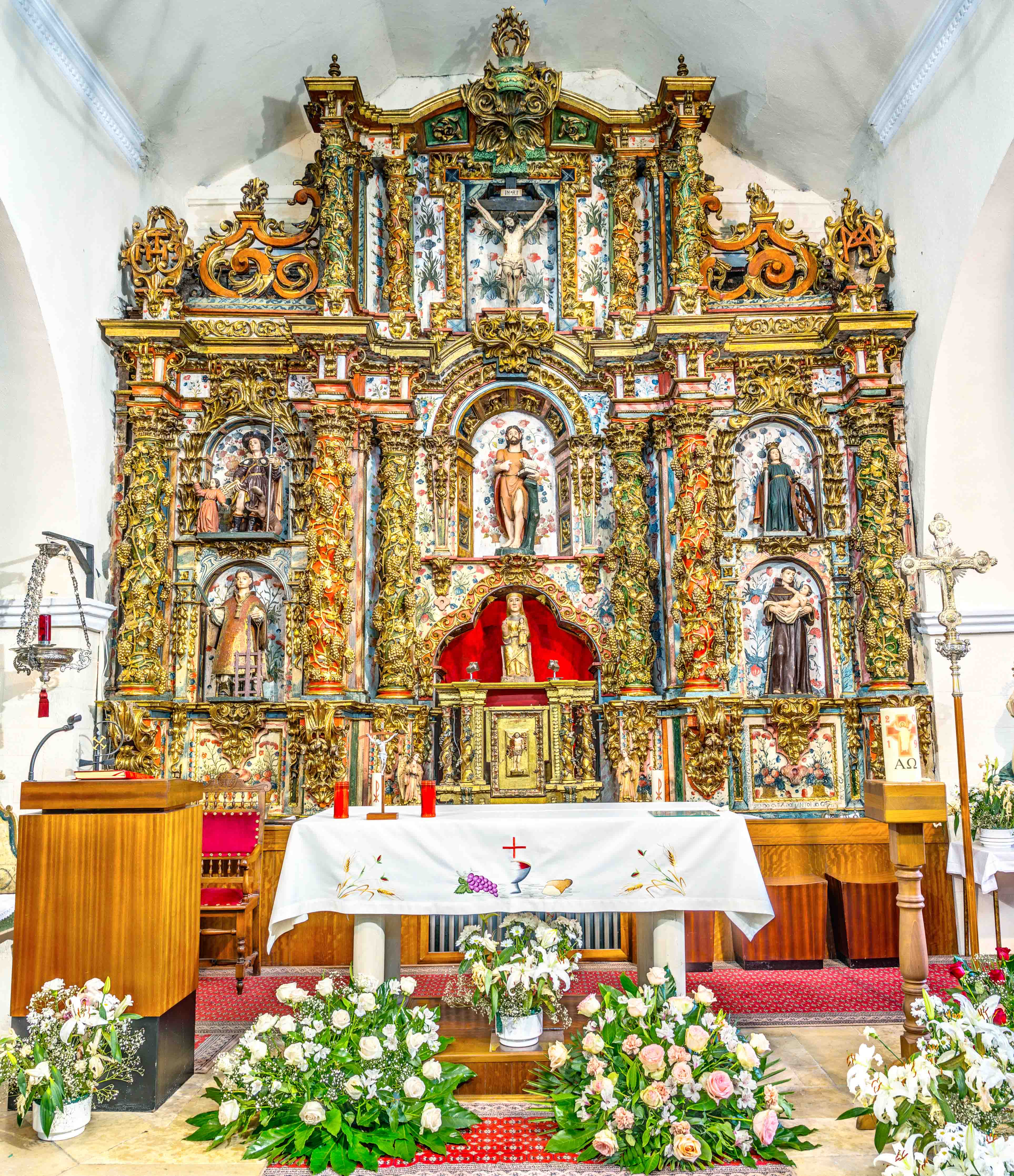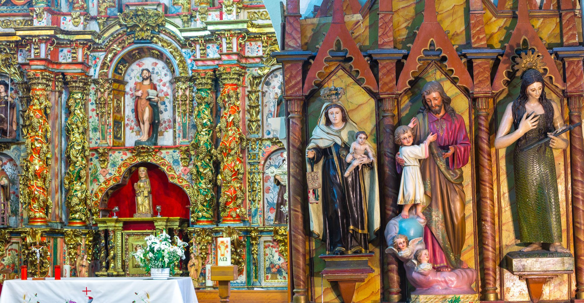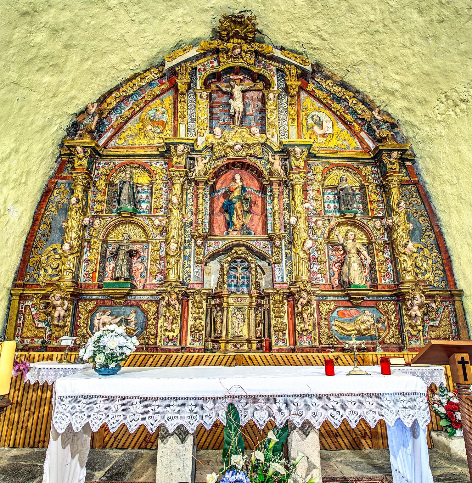 Consagrada a Santa María, la iglesia de Fasgar aún conserva el retablo barroco ricamente decorado.